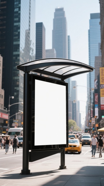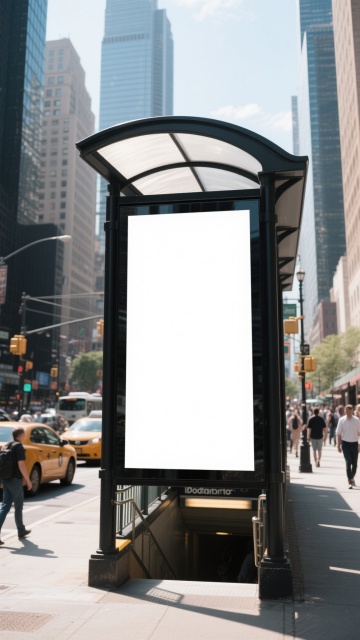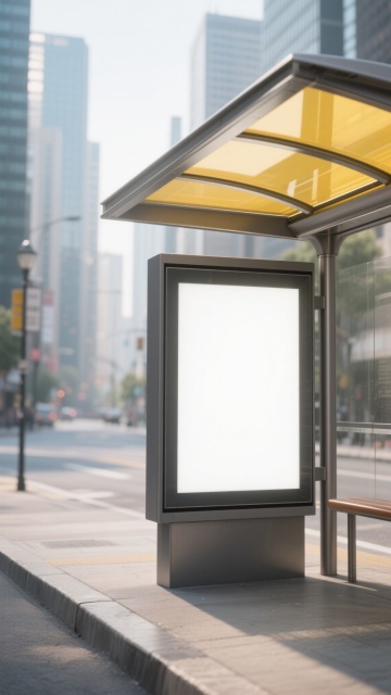 写实风格户外灯箱广告场景,灰色石质纹理墙面背景,金属边框灯箱嵌于建筑外立面上,灯箱面板为干净的白色,顶部有黄色秋叶局部点缀,前景有模糊动感的行人剪影,采用自然侧光照明,呈现清晰的阴影层次和真实的材质质感,营造现代都市的宁静氛围,灯箱设计简洁大方,符合商业户外广告展示需求,具有高信息传达效率和视觉层级感。