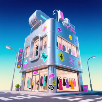 赛博朋克风3D建筑,霓虹灯点缀,金属质感搭配几何图形,未来感十足的虚拟现实潮流店铺,梦幻与科技交融。