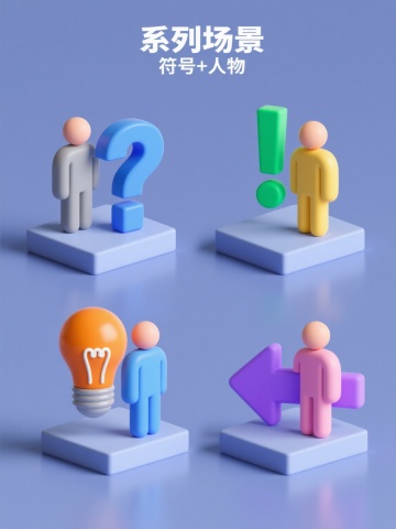 六个3D渲染的问号造型,每个问号具有不同的鲜艳配色(如蓝色、黄色、绿色、紫色、橙色、粉色)、独特样式(如光滑曲面、棱角分明、带纹理、透明感、金属光泽、磨砂质感)和材质表现(如塑料、金属、玻璃、橡胶、陶瓷、石材),每个问号旁各有一个姿态各异的白色3D小人(如思考、指向、仰望、疑惑、举手、奔跑),整体排列为上下两行各三个问号及对应小人,整齐对齐,背景为浅色(接近白色),高清晰度,卡通风格,简洁明了的构图,物体边缘清晰,具有柔和的阴影效果以增强立体感。
