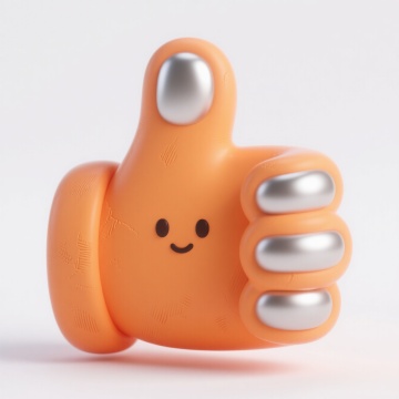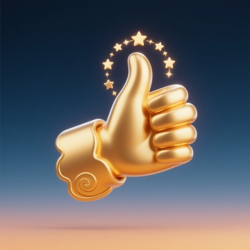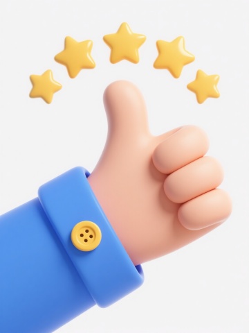 3D卡通风格,一只穿着蓝色袖子的卡通手,手心朝前,大拇指向上竖起,手部造型圆润可爱,肤色自然,蓝色袖子边缘有一个黄色纽扣,手的正上方有五颗黄色五角星,呈弧形排列,大小略有差异,星星表面光滑有光泽,整体画面采用干净简洁的白色背景,色彩明快和谐,光影柔和,具有明显的立体感和材质感,适合作为背景素材使用。