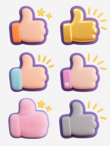 一套6个3D卡通风格点赞手势系列素材集合,每个素材均为纯色背景,保持圆润的3D建模风格、光滑的材质表面、柔和的高光与阴影效果,主体为伸出拇指的卡通手,手腕处有橙色袖口配白色装饰边,拇指上方有带白色心形的红色对话气泡图标。6个素材需展示完全不同的造型和角度:1. 正面标准点赞手势;2. 45度俯视点赞手势;3. 45度仰视点赞手势;4. 左手镜像点赞手势;5. 手部略微倾斜(约30度)的点赞手势;6. 手部半握拳状态下的点赞手势。所有元素规整排布,整体画面色彩变换为清新蓝色系(主色调#4A90E2,辅助色#5CB85C,点缀色#E2574A),每个素材独立呈现,保持一致的视觉风格与元素内容,确保系列感与设计统一性。