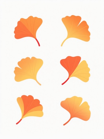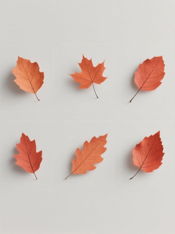 六个规整排布的落叶素材设计,保持简约现代风格,每个素材包含不同形态的落叶(有空中飘落的、半堆积的、单片舒展的等多种自然姿态),落叶呈现从橙黄色到红褐色的渐变色调,具有清晰的叶脉纹理和自然的边缘卷曲细节,整体造型简洁不繁复,所有素材均以纯白色纯色背景衬托,无任何文字、logo和水印。