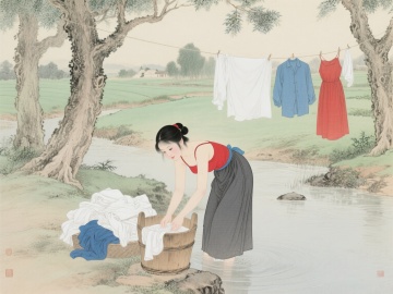 水彩工笔风,清新质朴,描绘女子溪边洗衣,衣衫晾晒,田园风光。