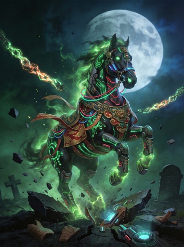 赛博朋克风机械战马,融合霓虹灯与金属质感,电路纹路交织神秘绿光,踏碎墓碑破土而出,背景满月映衬未来感与冲击力。