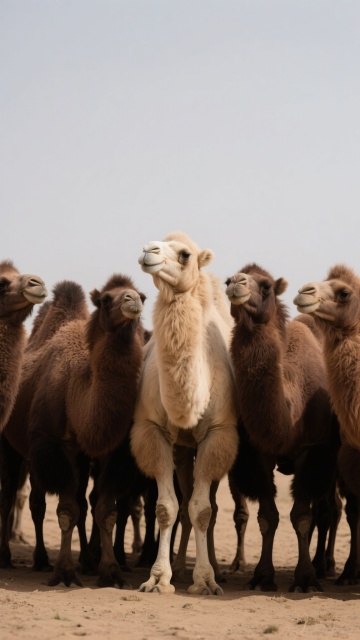 一群棕色双峰骆驼站在广阔的绿色草原上,近处的骆驼体型高大,毛发厚实呈棕黄色,颈部和背部驼峰边缘有深色鬃毛,它们姿态悠闲,有的侧头望向远方,有的低头似在休憩,远处还有几只骆驼散布在草原上形成层次感;背景是连绵起伏的雪山,山顶覆盖着皑皑白雪,山体呈蓝灰色和灰褐色渐变,天空湛蓝,漂浮着大片洁白的云朵,阳光明媚,光线明亮柔和,照亮了骆驼的毛发和草原的绿色,营造出开阔、自然、宁静而壮丽的高原风光,整体画面为写实摄影风格,色彩鲜明,细节清晰,展现出自然生态的和谐与壮美。