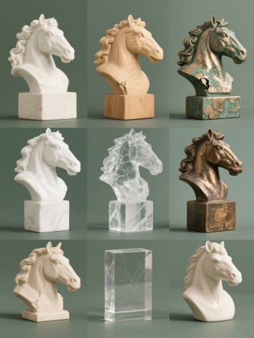 六个完全相同造型的马头大理石半身雕像(卷发、微侧头、凝视前方、肩部有破损细节、方形底座)组成的系列素材集合,每个雕像分别呈现出六种截然不同的材质质感:左侧第一个为洁白细腻的石膏材质,表面有轻微颗粒感;第二个为温暖自然的原木材质,带有清晰木纹和浅棕色色调;第三个为晶莹剔透的冰雕材质,半透明且内部有细微冰裂纹理;第四个为复古金属质感的青铜材质,表面有氧化绿锈和金属光泽;第五个为现代感的亚克力材质,高透