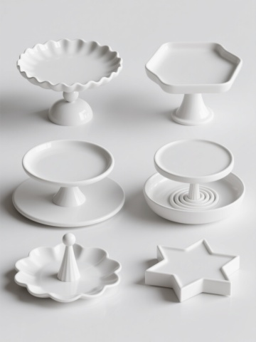 6个造型各异的白色蛋糕托盘系列素材集合,每个托盘均保持简约现代的3D渲染风格,拥有光滑的塑料质感和柔和的高光反射,主体色彩统一为纯净白色,托盘造型分别为:1.波浪边缘圆形底座配球形支柱;2.方形波浪边缘配四柱支撑;3.双层圆形叠加大底座;4.花瓣形边缘配螺旋纹支柱;5.六边形边缘配锥形支柱;6.星形边缘配多棱面底座,所有托盘规整排列于纯白色纯色背景上,整体构图平衡对称,视觉层级清晰,突出展示各托盘的独特造型设计与统一的材质质感,适合作为产品展示或设计素材使用。