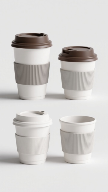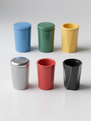 6个不同配色、不同样式、不同材质的水杯造型,上下两行对齐排列,每个水杯具有光滑的曲面和清晰的结构线条,呈现出真实的金属、陶瓷、玻璃等材质质感,柔和的光影效果凸显立体感,浅色简洁背景,整体构图平衡,具有广告海报般的清晰信息传达和现代设计感,无文字、LOGO、二维码及其他装饰元素。