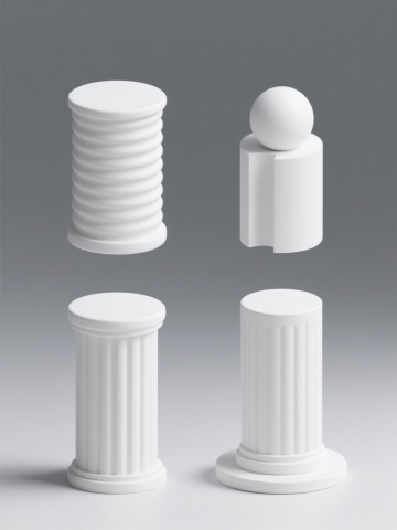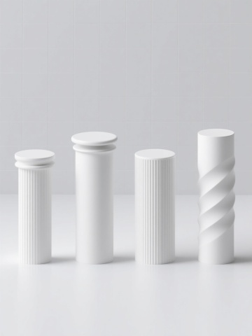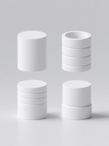 4K超高清,极简主义设计风格,纯白纯色背景,4个完全不同造型的白色圆柱元素系列素材集合,保持3D渲染的光滑塑料质感,柔和均匀的顶部光源,底部细微阴影增强立体感,圆柱造型分别为:1. 基础光滑圆柱体,2. 顶部带有同心圆凹槽圆柱体,3. 表面有纵向细条纹圆柱体,4. 上下两端略微内收的弧形圆柱体,4个圆柱元素呈2x2规整网格排布,间距均匀,整体构图平衡对称,无任何文字和二维码元素,高细节,高品质,专业产品展示级渲染效果。