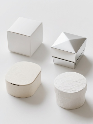四个不同风格的白色包装盒系列素材集合,每个包装盒造型各异,画面整体色彩变换,保持原元素内容,纯色背景,规整排布。第一个包装盒采用极简主义风格,造型方正,表面光滑,整体为纯净的白色;第二个包装盒为复古风格,造型带有弧度,表面有细微的纹理,整体为米白色;第三个包装盒是未来主义风格,造型棱角分明,表面有金属质感的光泽,整体为银白色;第四个包装盒为自然风格,造型圆润,表面有类似纸张的纹理,整体为奶白色。所有包装盒在白色背景上整齐排列,形成一个统一而又各具特色的系列。