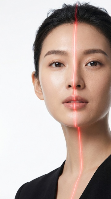 侧脸向上扬起的女性,双眼轻闭,深棕色头发优雅挽成低发髻,面部覆盖着由发光线条构成的网格,网格节点处有闪烁的白色光点,肌肤呈现出极致细腻、光滑、通透的质感,整体画面采用纯净的白色背景,光线柔和均匀地洒在人物轮廓上,营造出科技感与自然美的完美融合,突出皮肤的健康光泽与精致纹理,氛围宁静、高端且富有未来感。