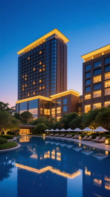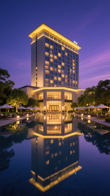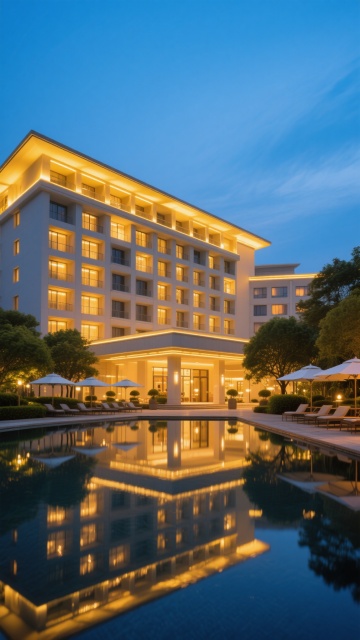 一座现代风格的高档酒店建筑,在黄昏时分的蓝色天空下,建筑顶部和底部有温暖的黄色灯光勾勒轮廓,酒店前方有一片平静的水面,清晰地倒映出建筑的灯光和轮廓,周围有绿树环绕,建筑底层有带遮阳伞的户外休息区,整体呈现出宁静、奢华、大气的氛围,建筑细节丰富,玻璃幕墙反射着天空的颜色,光影层次分明,画面构图平衡,具有强烈的视觉美感和高级感。
