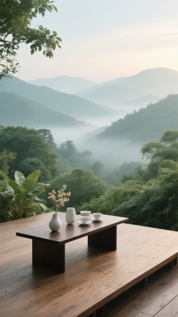 中景构图,一个融合东方禅意与现代工业美学的开放式厨房,哑光黑色火山岩台面与胡桃木柜体形成深沉对话,墙面是手工抹制的灰泥质感,中央悬挂着一盏由七根竹节串联而成的悬浮式吊灯,自然光透过磨砂玻璃推拉门在地面投下朦胧的光影,岛台边缘嵌入一条细长的流水槽,水面倒映着上方悬挂的铸铁锅具,台面上静置着一个粗陶茶碗和一株小型苔藓盆景,右侧墙面悬挂着一排铜制调料罐与竹制蒸笼,整体色调为深胡桃木色、哑光黑与苔藓绿的和谐共生,空气中弥漫着淡淡的原木清香与微湿的水汽。