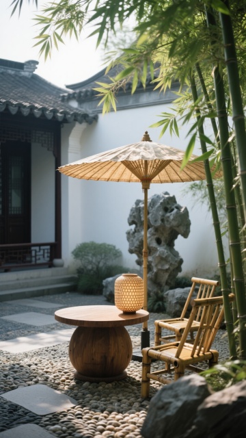 中国传统庭院,午后阳光透过茂密竹叶洒落斑驳光影,古朴竹编遮阳伞下,摆放着圆形木质矮桌和藤编灯笼,旁边配简约木椅,背景是白墙灰瓦的中式建筑和形态自然的假山石,地面铺着细小鹅卵石,整体呈现静谧禅意的东方美学氛围,色调以青灰、原木色和竹绿色为主,光影柔和,构图采用前景竹叶局部遮挡营造层次感,画面传递出悠然闲适的庭院生活意境。