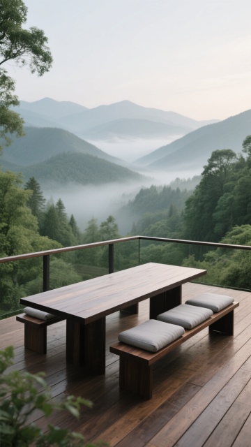 现代简约风格庭院设计,浅灰色木质甲板地面中央摆放着圆形混凝土餐桌,桌上有一盘水果,两侧是木质长椅,背景为白色矮墙,墙前种植着多种绿色植物,包括大型观叶植物和低矮灌木,左侧有高大树木,枝叶呈现绿色与橙黄色渐变,右侧有黑色金属框架木质顶棚,地面铺设白色鹅卵石与灰色石板台阶,整体采用自然光线,光影分明,色调以白色、灰色、木色和绿色为主,营造出宁静、舒适、具有高级设计感的户外休闲空间。