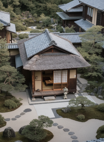 日式侘寂风餐厅内部场景,原木色餐桌椅整齐排列,墙面悬挂浮世绘风格装饰画,天花板垂下和纸灯笼散发柔和暖光,窗边绿植点缀生机,整体氛围宁静质朴,木质纹理清晰可见,光线柔和自然,营造出简约而富有禅意的用餐空间。