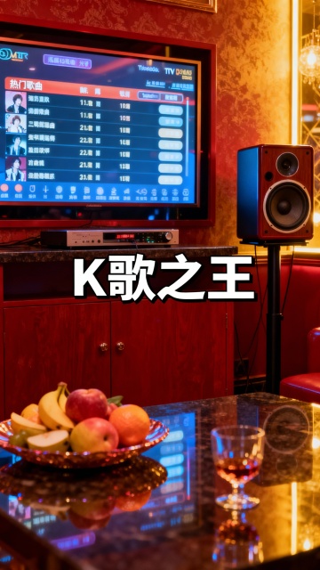 现代风格K歌海报,中央是一台时尚设计的电视,屏幕亮着动感的K歌界面,电视两侧各站一人,手持麦克风,姿态投入地对着电视歌唱,人物表情愉悦,充满活力,背景为渐变的蓝紫色调,点缀动感光斑和音符元素,上方中央位置有“K歌电视”四个醒目大字,字体现代简约,带有光影效果