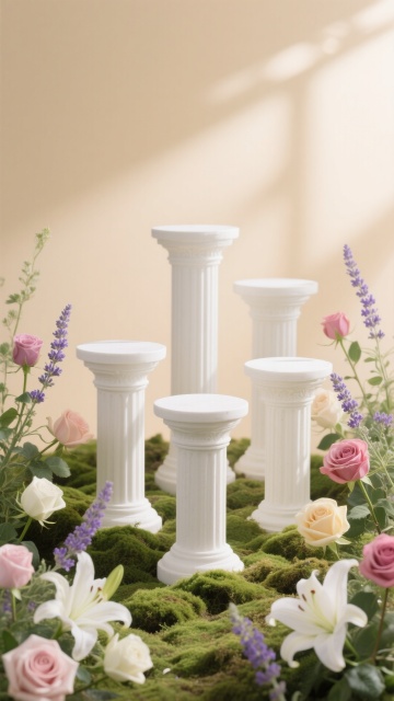 背景是的色飘逸的窗帘,前景是透明的粉白展台,展台周围环绕着盛开的玫瑰花朵,营造出温馨、甜蜜的氛围
