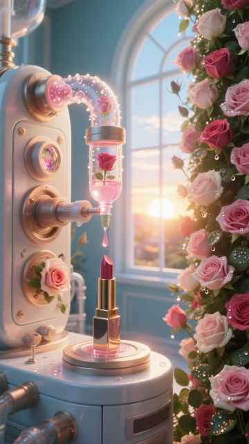 梦幻3D风,未来感机械与浪漫玫瑰交织,液态金属光泽,超现实主义美学。