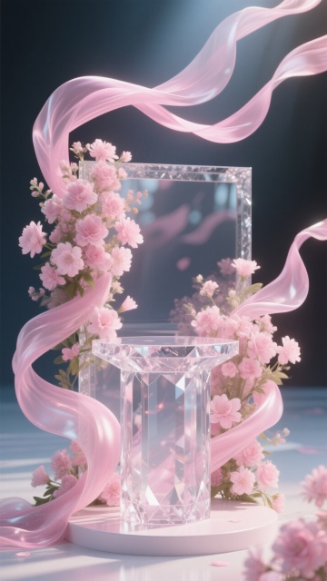 梦幻3D风,粉色液态丝带缠绕透明水晶花瓶,营造甜美浪漫的虚拟自然场景。