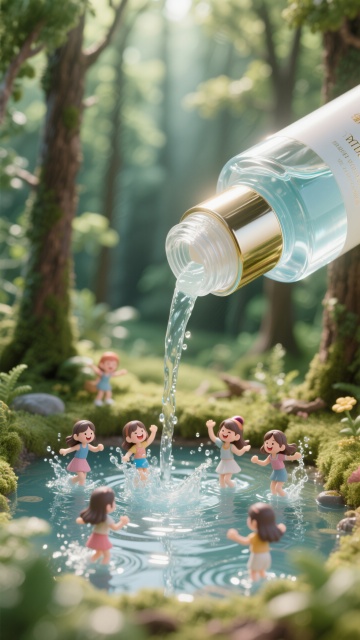 在湖泊中有一个岛,视觉中心放我们巨大的护肤产品,背景有云,有雾,有花、有光影,有树木和植物,有漂浮的气泡和空气颗粒,c4d风格