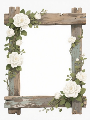 一个由风化质感的木质框架构成的花架,框架呈现出自然的木纹肌理和轻微的磨损效果,四角和立柱上缠绕并盛开着白色的花朵,花朵形态饱满,花瓣层次分明,搭配绿色的叶片和细小的藤蔓,整体风格保持数字插画的细腻质感和清晰边缘,框架中间区域为纯白色,整个画面背景为纯白色,营造出简洁、清新且具有自然装饰感的视觉效果。