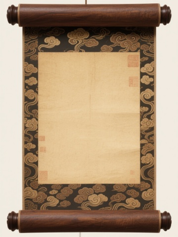 中国传统水墨画卷,浅米色宣纸卷轴,深棕色木质卷轴头,两侧棕色边框装饰祥云纹样,整体呈现古朴典雅的东方美学风格,画面留白充足,营造宁静悠远的文化氛围。