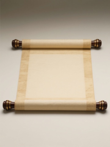 3D渲染的中式卷轴边框,浅色背景,卷轴上下端为深棕色木质卷轴头,配以金色圆形装饰,卷轴主体边框为米白色布艺材质,边缘有精致的深蓝色回纹刺绣图案,整体呈现出典雅庄重的中式风格,立体感强,光影过渡自然,细节清晰。