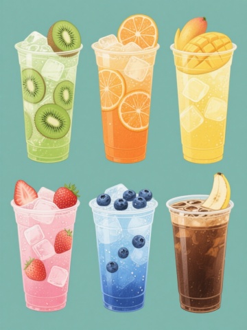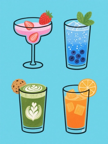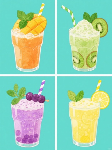 系列下午茶甜点插画,保持水彩质感的手绘风格,柔和的色彩过渡,细腻的笔触纹理,统一的纯白色纯色背景,四个完全不同的下午茶元素规整排布成2x2网格布局。左上角:焦糖布丁,米黄色布丁体,顶部淋有棕色焦糖酱,点缀一片新鲜草莓和一朵白色小花;右上角:草莓奶油蛋糕,双层海绵蛋糕夹着粉色奶油,表面铺满新鲜草莓和白色奶油花;左下角:蓝莓马芬,金黄色蛋糕体,顶部有蓝莓果酱和新鲜蓝莓,撒有白色糖粉;右下角:抹茶慕斯杯,透明玻璃杯内是浅绿色抹茶慕斯,底层有饼干碎,顶部装饰抹茶粉和一片薄荷叶。每个甜点都有精致的细节和柔和的光影效果,整体风格统一,色彩和谐,充满温馨甜美的氛围。
