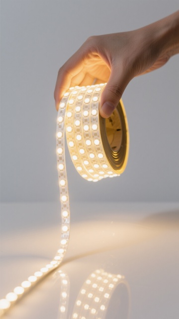 暗灰色背景上,多条柔和弯曲的灯带,暖黄色LED灯泡均匀排列,每个灯泡散发着朦胧的圆形光晕,光线柔和不刺眼,灯带线条纤细呈白色,整体营造出温馨浪漫的氛围,灯光分布错落有致,形成自然流畅的视觉曲线,无文字及其他装饰元素,仅有纯粹的灯带光影效果。