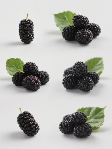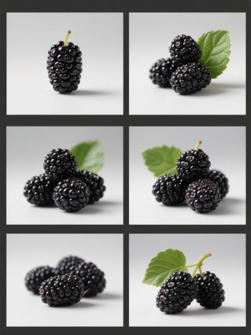 写实风格摄影,阳光下的黑莓藤特写,藤蔓上挂满不同成熟度的黑莓果实,从深紫色、红色到绿色渐变,果实饱满有光泽,表面颗粒清晰可见,周围是茂密的绿色锯齿状叶片,叶片有明显的叶脉和光影斑驳效果,背景虚化呈现自然绿色调,整体氛围清新自然,光线明亮柔和,展现植物的生机与果实的质感,色彩真实还原,细节丰富,构图饱满,突出主体果实的层次感和立体感。