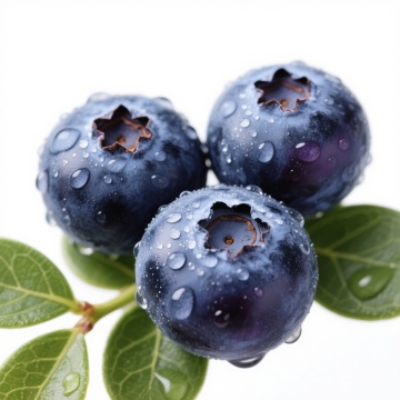 三颗饱满圆润的蓝莓,表面覆盖着晶莹剔透的水珠,呈现出深邃的靛蓝色,带有自然的果霜质感。蓝莓顶部的果蒂呈深褐色,微微开裂。蓝莓下方衬托着几片鲜绿的椭圆形叶子,叶脉清晰可见,叶片边缘光滑。整体构图简洁,主体突出,采用高清晰度的写实摄影风格,光线明亮柔和,水珠反光细腻,背景为纯白色,营造出清新、新鲜、水润的视觉效果,完美展现蓝莓的天然色泽与质感。