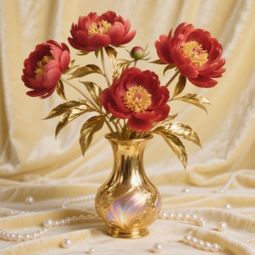丝绒质地背景上,鎏金花瓶插盛放芍药(火红花瓣+金蕊),瓶身流淌霞光 珍珠散落 给缺金缺火之人
