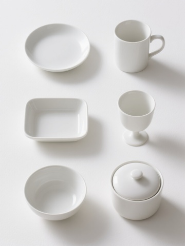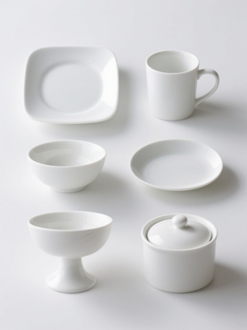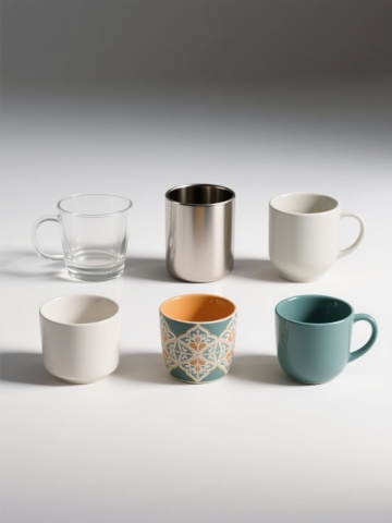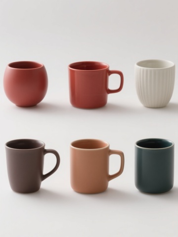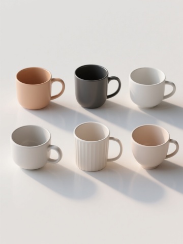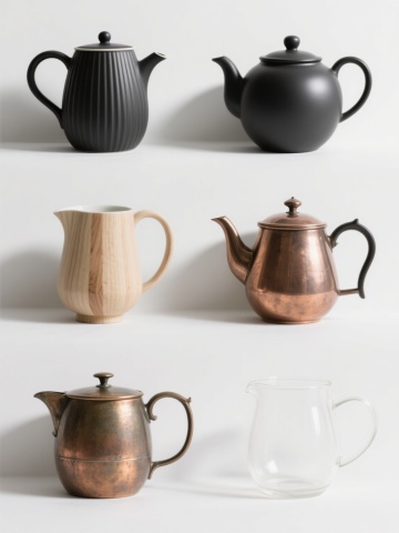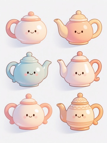 6个不同样式、不同种类的茶壶,排列整齐,白色背景,每个茶壶都有独特的造型和设计,具有陶瓷质感,色彩丰富,光影柔和,高光细腻,阴影自然,整体构图平衡,画面简洁干净,展现出茶壶的优雅形态和细节特征。