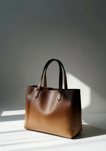 极简主义风格白色手提袋,袋身采用厚实挺括的哑光白色卡纸材质,表面光滑无纹理,搭配灰绿色宽扁状皮质手提带,手提带与袋身连接处有精致的缝线细节,袋子放置于浅灰色光滑水泥台面上,整体呈现出柔和的侧上方自然光照射效果,光线在袋身侧面形成自然的明暗过渡阴影,水泥台面反射出微弱的光泽,背景更换为简约的米白色渐变磨砂质感墙面,手提袋样式调整为底部带有细微内收弧度的梯形轮廓设计,整体画面保持干净、高级、简约的静物摄影氛围,色彩统一在低饱和度的灰白绿配色体系中,突出材质的细腻质感和光影的微妙变化。