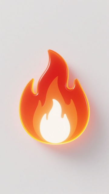 纯白色背景,单个火焰元素,规整排列,火焰呈现出橙红色渐变,边缘有黄色高光,内部有明亮的白色火焰核心,火焰形态自然流畅,具有透明的燃烧质感,火焰的动态感强,仿佛正在燃烧跳动,整体画面简洁干净,突出火焰元素的视觉效果,符合设计感,信息传达效率高。