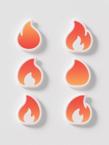 六个不同风格的火苗图标集合,规整排列在纯色背景上。每个火苗造型独特,色彩各异,保持火焰基本形态但风格迥异。1. 扁平化设计风格:橙色渐变火苗,简洁线条,无阴影,现代感十足;2. 像素艺术风格:8位像素火苗,红黄色块拼接,复古电子游戏视觉效果;3. 水彩风格:柔和的蓝紫色调火苗,边缘模糊,色彩晕染效果,艺术感强;4. 霓虹风格:亮粉色和蓝色霓虹火苗,发光效果,黑色背景,赛博朋克感;5. 3D立体风格:黄色渐变火苗,有体积感和光影效果,立体感强;6. 手绘风格:棕色线条勾勒的卡通火苗,橙色填充,童趣可爱。所有火苗图标大小一致,排列整齐,背景为纯灰色,简洁干净。