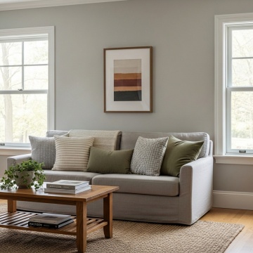极简风装修室内场景,浅灰色布艺沙发配米白色靠垫,原木色细腿小茶几上放着插有干花的透明玻璃瓶,沙发前铺着米色编织地毯,浅灰色墙壁悬挂白色编织纹理吊灯,整体以浅灰、米白、原木色为主色调,光线柔和明亮,空间宽敞留白,线条简洁流畅,材质注重自然质感,营造宁静、舒适、简约的居住氛围,无任何多余装饰元素。