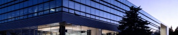 现代主义风格工厂建筑,简洁的白色几何体块外观,大面积玻璃幕墙入口,整齐排列的条形窗户,开阔的混凝土广场,道路旁点缀着几棵高大的绿树,晴朗的蓝色天空中飘着少量白云,光线明亮柔和,阴影清晰,整体呈现出干净、专业、高效的工业氛围。