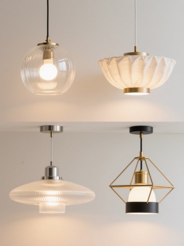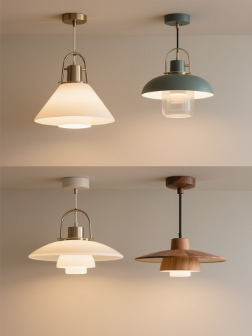 极简主义产品摄影风格,四个不同样式的台灯(一个黑色金属可调节臂台灯,一个白色陶瓷简约台灯,一个原木色北欧风台灯,一个彩色玻璃艺术台灯),每个台灯具有独特配色和设计风格,统一的纯色背景(白色),台灯呈整齐的两排两列排列,精确的光影效果,柔和的顶部光源,清晰的物体轮廓,光滑的材质表现,高清晰度,产品展示感,简洁构图,无任何文字或logo。