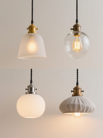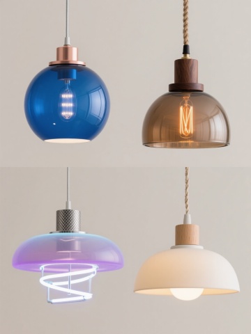 一套6个不同配色与造型的工业风吊灯素材集合,保持原3D渲染的写实质感与金属光泽,每个吊灯均有独特设计:1.哑光黑金属灯罩配琥珀色玻璃灯泡与黄铜连接件;2.复古红烤漆灯体搭配透明灯泡与黑色吊线;3.磨砂白陶瓷底座配螺旋纹路玻璃灯罩;4.青古铜色穹顶灯罩内置暖白光LED灯芯;5.几何切割金属框架搭配彩色玻璃罩;6.木质纹理灯座与黑色金属支架组合。所有吊灯以2×3网格规整排列,每个灯具均悬浮于独立的纯色背景上(分别为浅灰、米白、淡蓝、赭石、薄荷绿、浅卡其),保持统一的45度俯视角与柔和顶光效果,阴影清晰可见,整体呈现专业产品展示级的视觉效果。