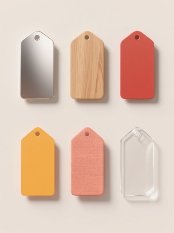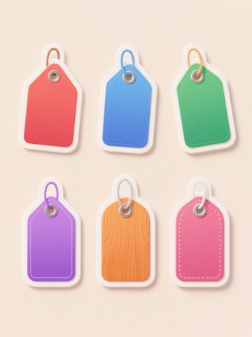 6个不同配色、不同样式、不同材质的价格标签造型,采用简洁的卡通矢量风格,边缘有白色高光和立体阴影效果,每个标签具有独特的色彩(如红色、蓝色、绿色、紫色、橙色、粉色等)、样式(如不同形状的边角、不同大小的挂孔、不同纹理的挂绳)和材质质感(如金属光泽、磨砂质感、光滑塑料感、木纹纹理、布纹质感、皮革质感),浅色背景,上下两行各3个标签整齐对齐排列,无任何文字,整体画面简洁明快,色彩鲜明,具有清晰的视觉层级和信息传达效率,符合现代简约的设计感。