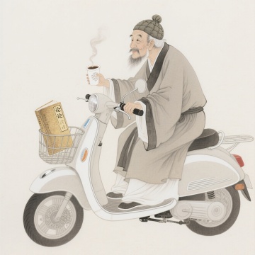 中式感插画风,古装人物骑现代电动车,手捧热饮,创意融合古今元素。