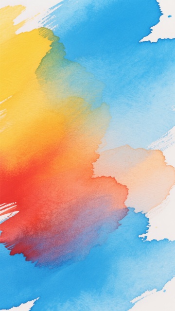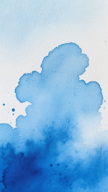 水彩风格的蓝色渐变背景,从画面顶部的浅淡天蓝色柔和过渡到底部的深邃靛蓝色,呈现出自然晕染的层次感。湿润的颜料在纸张上形成不规则的云朵状色块,边缘带有朦胧的虚化效果,部分区域因水分聚集而产生较深的蓝色斑点和水渍纹理,整体色调清新通透,营造出宁静而空灵的氛围,色彩过渡自然流畅,无明显笔触痕迹,充满水彩特有的轻盈与流动感。