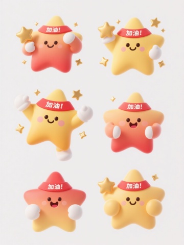 六个不同样式、不同造型、不同姿势、不同配色的加油主题卡通元素,每个元素都具有圆润可爱的Q版风格,类似黄色星星角色的友好表情和动态感,带有简洁的线条和柔和的渐变色彩,白色背景,元素排列整齐有序,每个角色都有独特的加油姿态和装饰,整体保持统一的卡通可爱风格和积极向上的氛围。