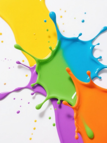 白色背景上,一团充满动感的抽象色彩飞溅图案,主要由明亮的黄色、橙色、粉色、蓝绿色和深紫色等鲜艳色彩构成,色彩间有自然的交融过渡,边缘呈现出不规则的、富有张力的笔触效果,整体形态如同颜料被快速挥洒而成,具有液态金属的光滑质感和强烈的光泽感,色彩饱和且富有层次,光影效果突出,给人一种活力四射、流动飘逸的视觉感受。