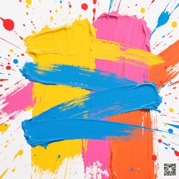 一幅充满活力的抽象画作,画面中心由几条主要的、相互交错的彩色笔触构成,色彩包括明亮的黄色、鲜艳的蓝色、温暖的橙色和柔和的粉色。笔触呈现出明显的方向性,从左上角向右下角倾斜延伸,形成动感的视觉效果。笔触边缘带有自然的毛躁感和飞白,周围散布着许多细小的、随机分布的彩色墨点和飞溅痕迹,增强了画面的灵动性和艺术张力。整体构图饱满而不失平衡,色彩对比强烈且和谐统一,营造出欢快、奔放、充满创造力的氛围。画面背景为纯白色,使得彩色笔触更加鲜明突出。笔触质感改为光滑细腻的亚克力颜料效果,色彩过渡均匀柔和,带有轻微的光泽感,同时保留笔触的形态和飞溅墨点的细节。