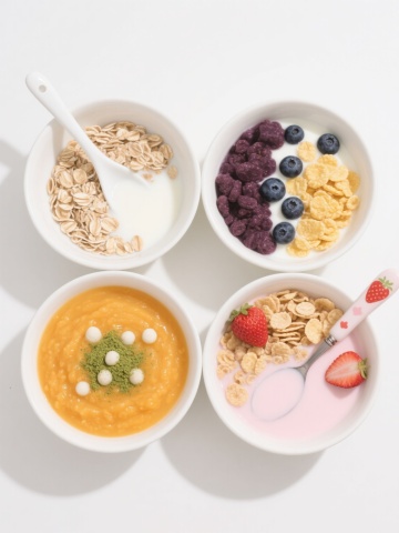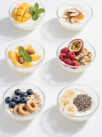 一张展示6个完全不同酸奶元素内容的系列素材集合海报,采用纯白色纯色背景,保持高清写实摄影风格,光线为柔和的顶部自然光,带有轻微的阴影以增强立体感。画面中6个元素呈规整的2x3网格排布,每个元素都具有细腻的质感表现:1. 玻璃罐中装有分层的草莓酸奶,顶部点缀新鲜草莓切片和薄荷叶;2. 陶瓷碗里的希腊酸奶,表面撒有碾碎的核桃和蜂蜜流淌的纹理;3. 木质托盘上的酸奶冰棒,插着彩色纸质伞签,周围散落几颗蓝莓;4. 透明塑料杯中是带有燕麦颗粒的搅拌型酸奶,杯壁凝结着细密的水珠;5. 竹编小篮中放着酸奶水果杯,底层是燕麦,中层是酸奶,上层铺满芒果丁和奇异果片;6. 浅口石碗中的无糖酸奶,搭配一小碟有机蜂花粉和薰衣草干花装饰。所有元素保持统一的高清写实质感,酸奶的细腻光泽、容器的材质纹理(木纹、玻璃透明度、陶瓷颗粒感)以及配料的自然细节都清晰可见,整体构图平衡对称,信息传达直接明了,符合食品素材的清新、健康视觉风格。