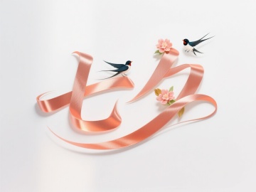 创意七夕字体设计,由缎带巧妙地弯曲和缠绕构成立体感和视觉冲击力。整体风格简约而现代,光线均匀分布,营造出一种干净、清晰的氛围。喜鹊和花朵作为装饰。