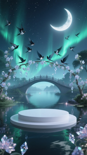 梦幻的七夕氛围,新月、极光交织,鹊桥横跨湖面,花枝缀着白花与水晶,喜鹊翩飞,浪漫又神秘,尽显七夕的美好意境。